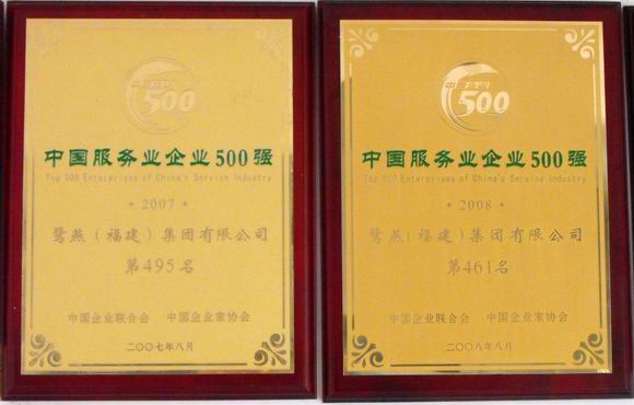 鷺燕集團又傳捷報,在榮獲了“市百強企業(yè)”、“市重點(diǎn)民營(yíng)企業(yè)”、“湖里區十佳文明企業(yè)”之后,再次榮獲“中國服務(wù)企業(yè)500強”稱(chēng)號,這已是鷺燕集團連續三年獲此殊榮。