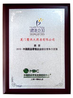 由中國藥品零售發(fā)展研究中心(MDC)、中國醫藥企業(yè)合作與發(fā)展組織(CPEO)、中國藥品品牌評審委員會(huì )主辦的“健康中國?2010中國藥品品牌評選活動(dòng)”,經(jīng)過(guò)為期半年的品牌征集、品牌入圍和專(zhuān)家評選階段,于6月21日公布了“健康中國?2010中國藥品品牌榜”榜單,鷺燕大藥房榮登“健康中國?2010?中國藥品零售企業(yè)綜合競爭力百強”企業(yè)。 |