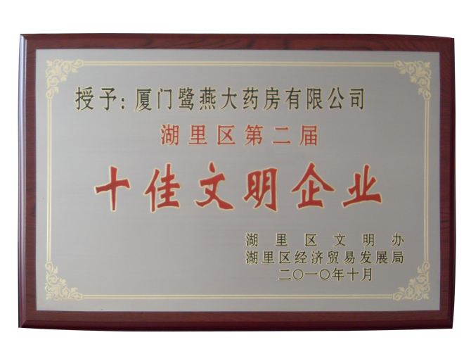 廈門(mén)鷺燕大藥房有限公司于2010年10月被廈門(mén)市湖里區文明辦、廈門(mén)市湖里區經(jīng)濟貿易發(fā)展局評為湖里區第二屆“十佳文明企業(yè)“榮譽(yù)稱(chēng)號。
